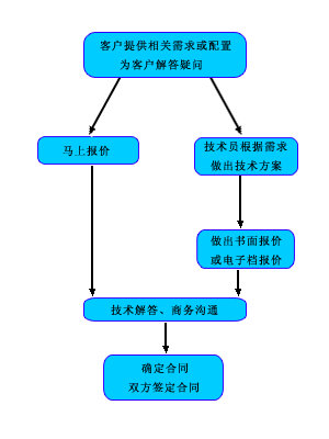 客戶提出購買的規(guī)格和要求——技術(shù)部做出方案——銷售報價——客戶看方案是否滿意——雙方技術(shù)溝通—— ***終達成協(xié)議簽訂合同——公司出產(chǎn)品——跟蹤客戶回訪