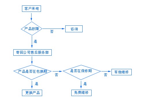 1、是產(chǎn)品問題則需要寄回公司售后部門 2、不是產(chǎn)品問題,需要專業(yè)人員為客戶解答問題——產(chǎn)品在包換期內(nèi) 1、公司按規(guī)定更換產(chǎn)品 2、不在更換期內(nèi)***到維修部——1、在維修期公司免費(fèi)維修 2、不在維修期內(nèi)則需要看產(chǎn)品決定有償維修,******再議